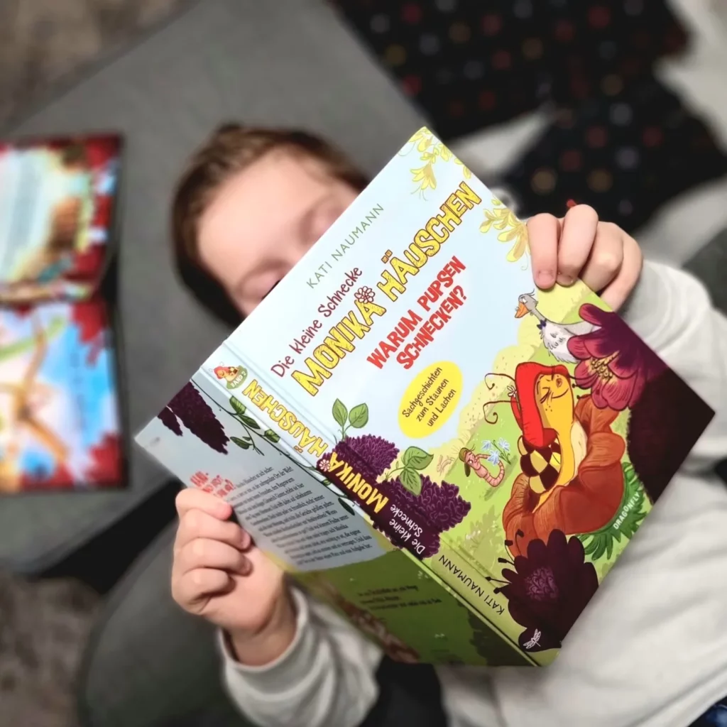 Bei diesem Buch hat uns ganz klar das Cover neugierig gemacht. Die zwei rennenden Kinder mit den kleinen Monsterchen im Vordergrund und das große Wesen mit den gruseligen Augen im Hintergrund sieht schon total vielversprechend aus.