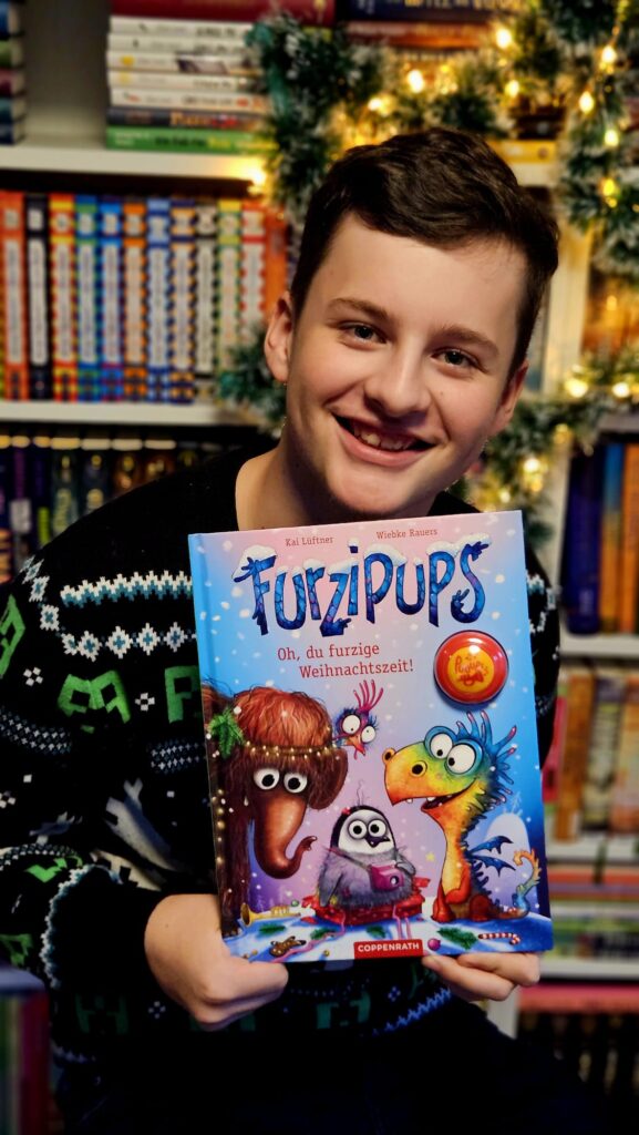 Das Buch ist für junge Leser und Leserinnen gedacht und Kai Lüftner hat alles in lustiger Gedichtform geschrieben. Außerdem sind richtig weihnachtliche Bilder von Wiebke Rauers sowohl auf dem Cover, als auch natürlich im Buch selbst. Diese Bilder haben mich richtig schön nach Weihnachten versetzt, die sehen alle super aus. Außerdem liegt dem Buch ein Furzknopf bei. Ja, da ist ein kleiner Knopf, wo man draufdrücken kann, dann gibt’s was zu lachen!